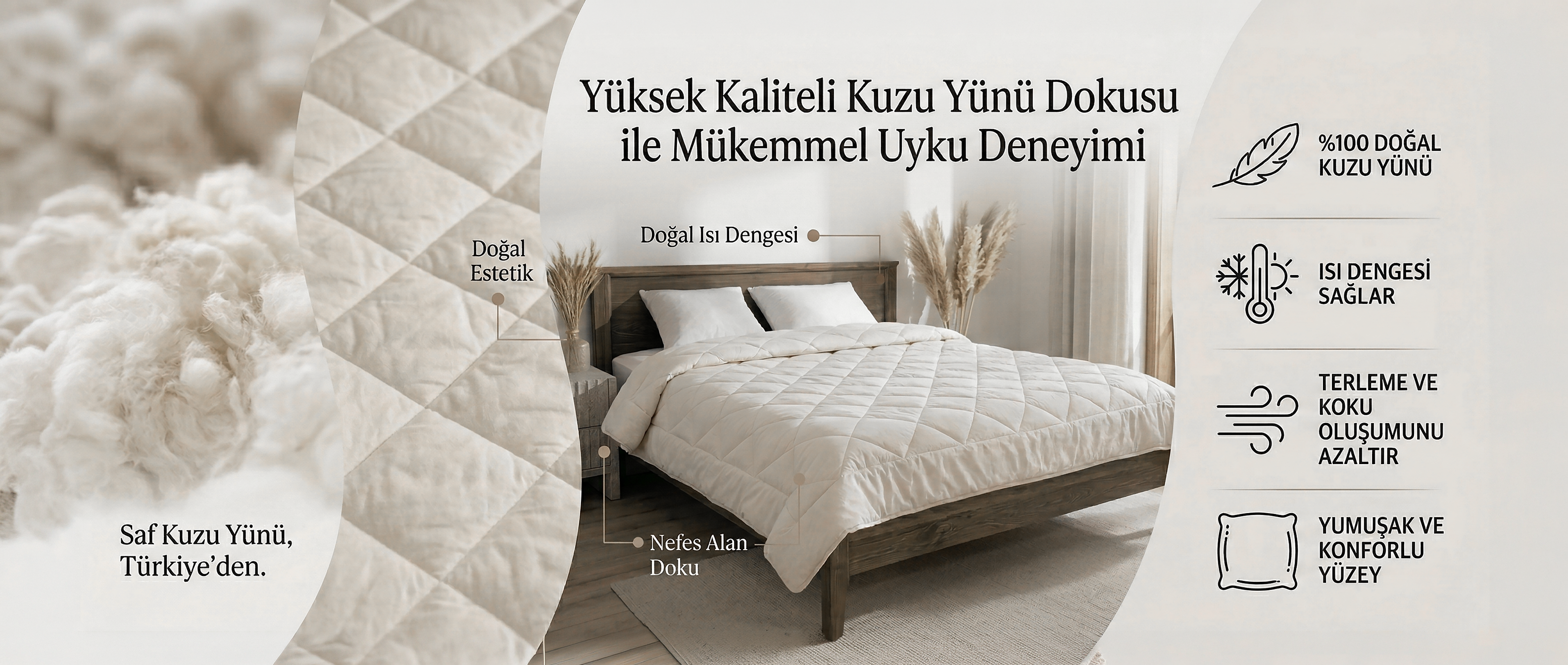 Kuzu yününden el emeğiyle özenle üretilen yorgan, yastık ve yatak pedleri ; doğal yapılarıyla sadeliği ve konforu bir arada sunuyoruz.